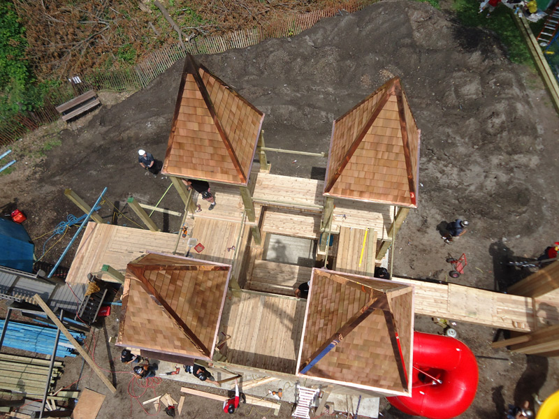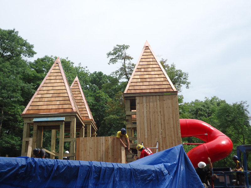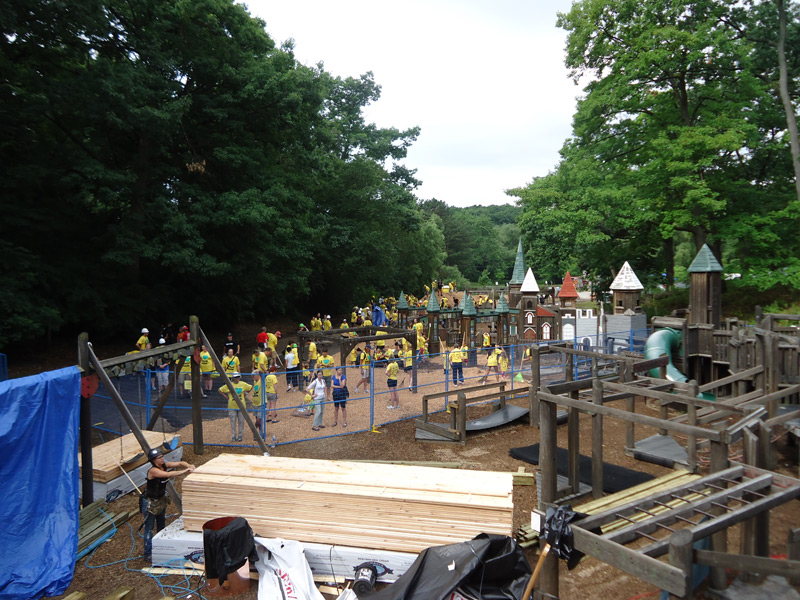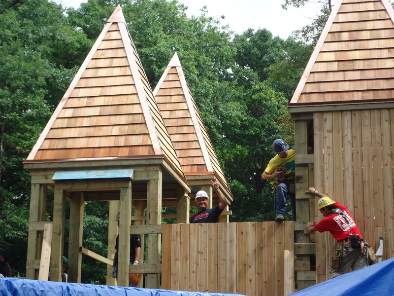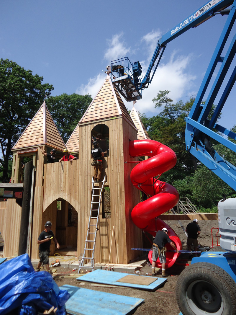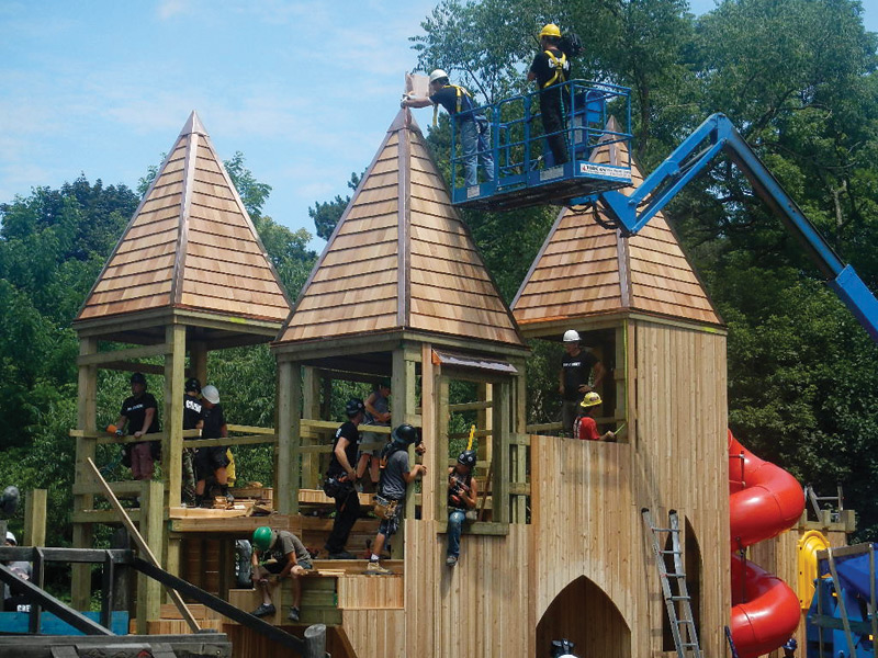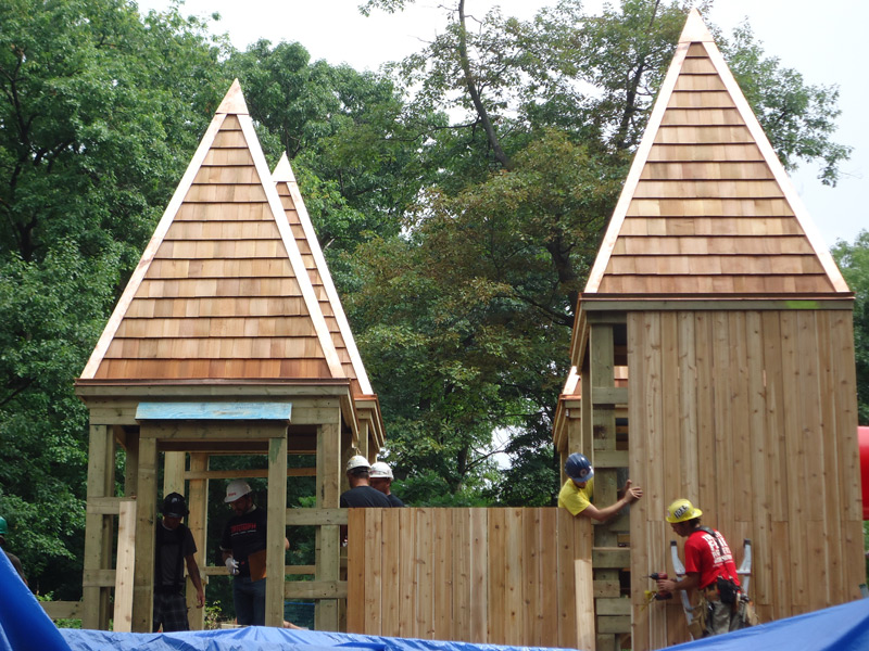 In March of 2012, a portion of the wooden play structures at the beloved Jamie Bell Adventure Playground in High Park was burned down by arsonists. After months of debate over how the playground would be rebuilt, TV celebrity renovator Mike Holmes took charge of the project with a team of Howard Park’s developer Triumph Developments and hundreds of neighbours, community figures and volunteers. The new castle was rebuilt on the recordbreaking hot weekend of July 7–8, 2012.