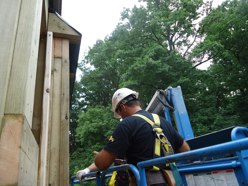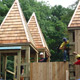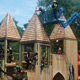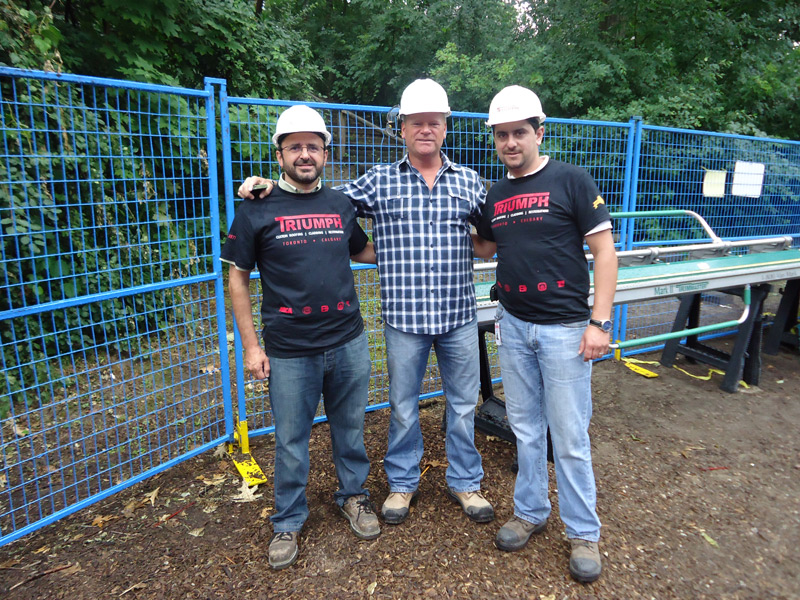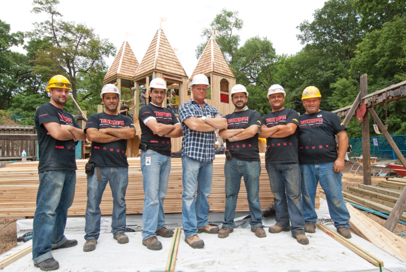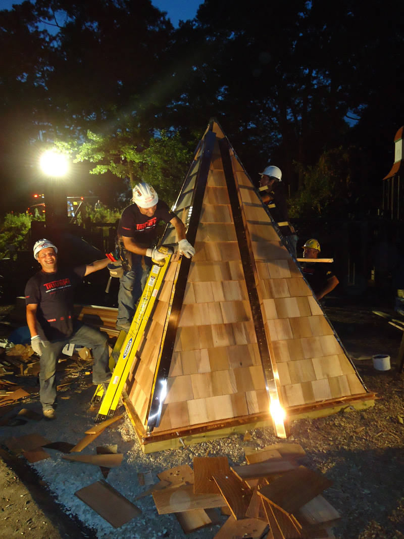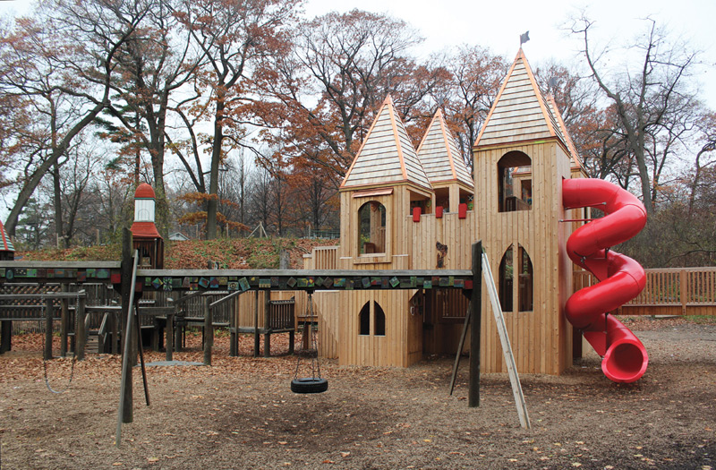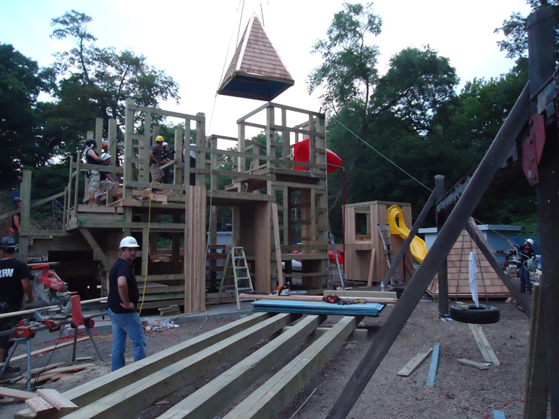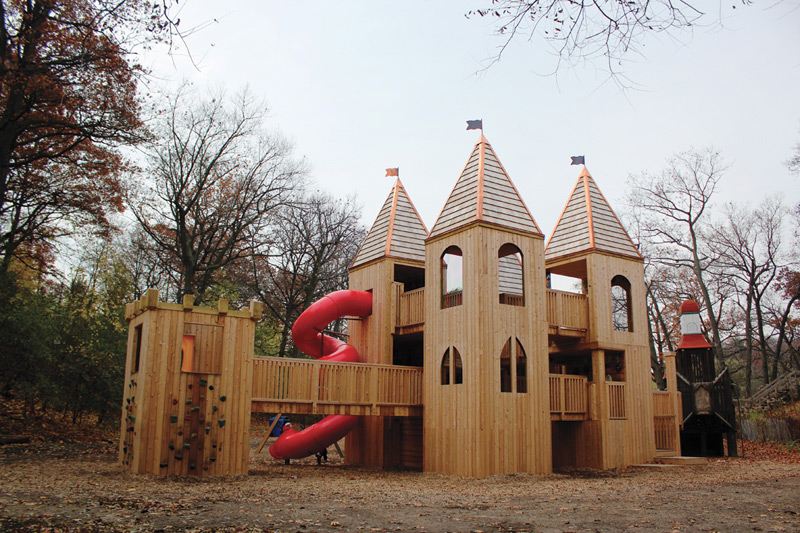 In March of 2012, a portion of the wooden play structures at the beloved Jamie Bell Adventure Playground in High Park was burned down by arsonists. After months of debate over how the playground would be rebuilt, TV celebrity renovator Mike Holmes took charge of the project with a team of Howard Park’s developer Triumph Developments and hundreds of neighbours, community figures and volunteers. The new castle was rebuilt on the recordbreaking hot weekend of July 7–8, 2012.