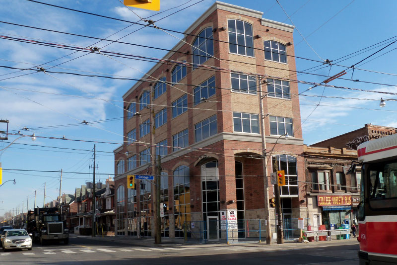 Located at the intersection of College Street and Ossington Avenue in the heart of Little Italy, this recently completed building features traditional architectural detailing helping it blend nicely into the existing neighbourhood. The building features prime retail and office opportunities in a centrally located neighbourhood.